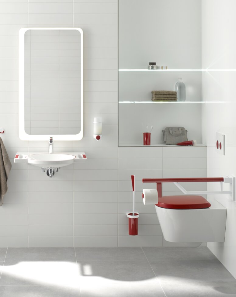Ergänzend sollten Haltegriffe an WC, Waschtisch und Dusche fest eingeplant werden. Sie bieten nicht nur Stabilität beim Aufstehen und Hinsetzen, sondern auch Sicherheit bei Transfers aus dem Rollstuhl. Für noch mehr Komfort lassen sich Stützklappgriffe und höhenverstellbare Systeme integrieren, die flexibel auf individuelle Bedürfnisse reagieren. Auch eine gute Beleuchtung trägt wesentlich zur Sicherheit bei: blendfreie, gleichmäßige Lichtquellen und gezielte Spots an Funktionsbereichen wie WC, Waschtisch und Spiegel erhöhen die Nutzungsqualität.