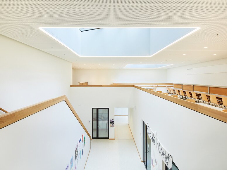 The air space with large skylight emphasises the open, bright and modern spatial structure of the new extension in the inner courtyard.